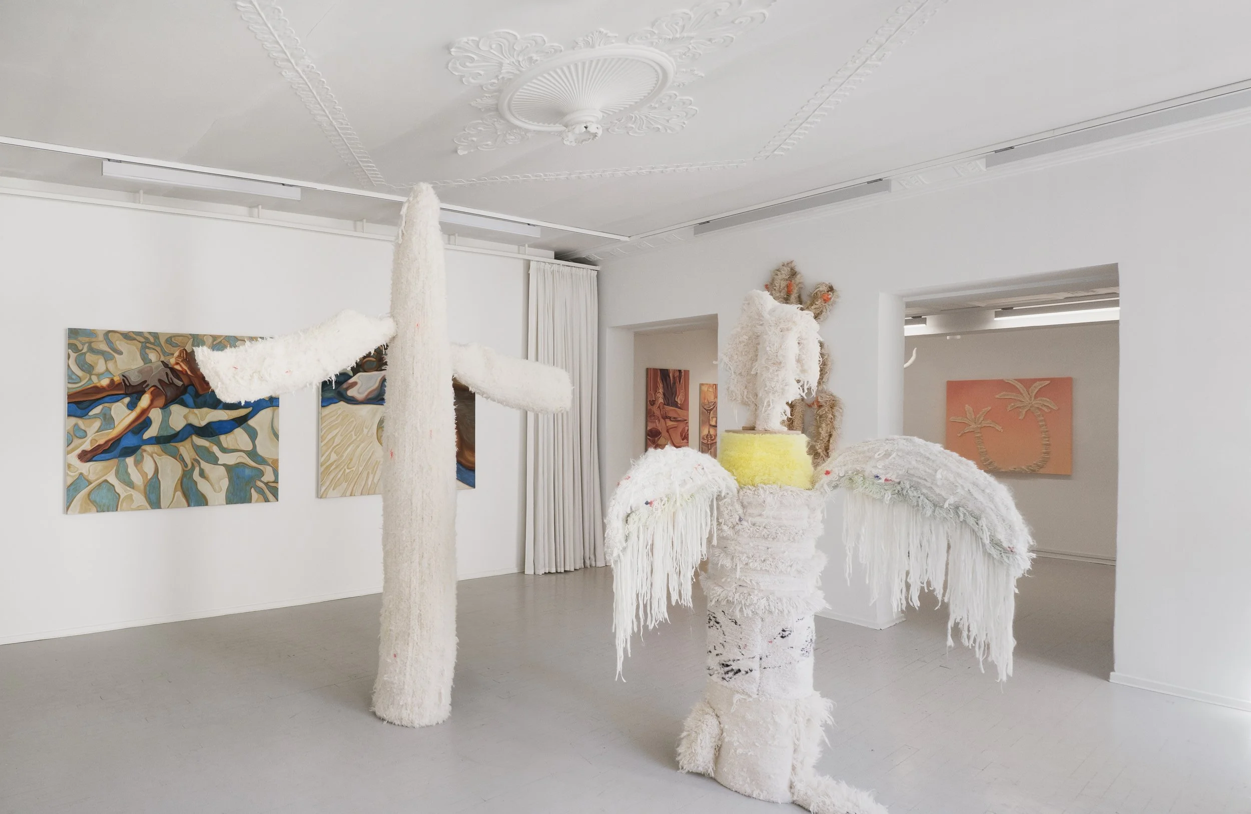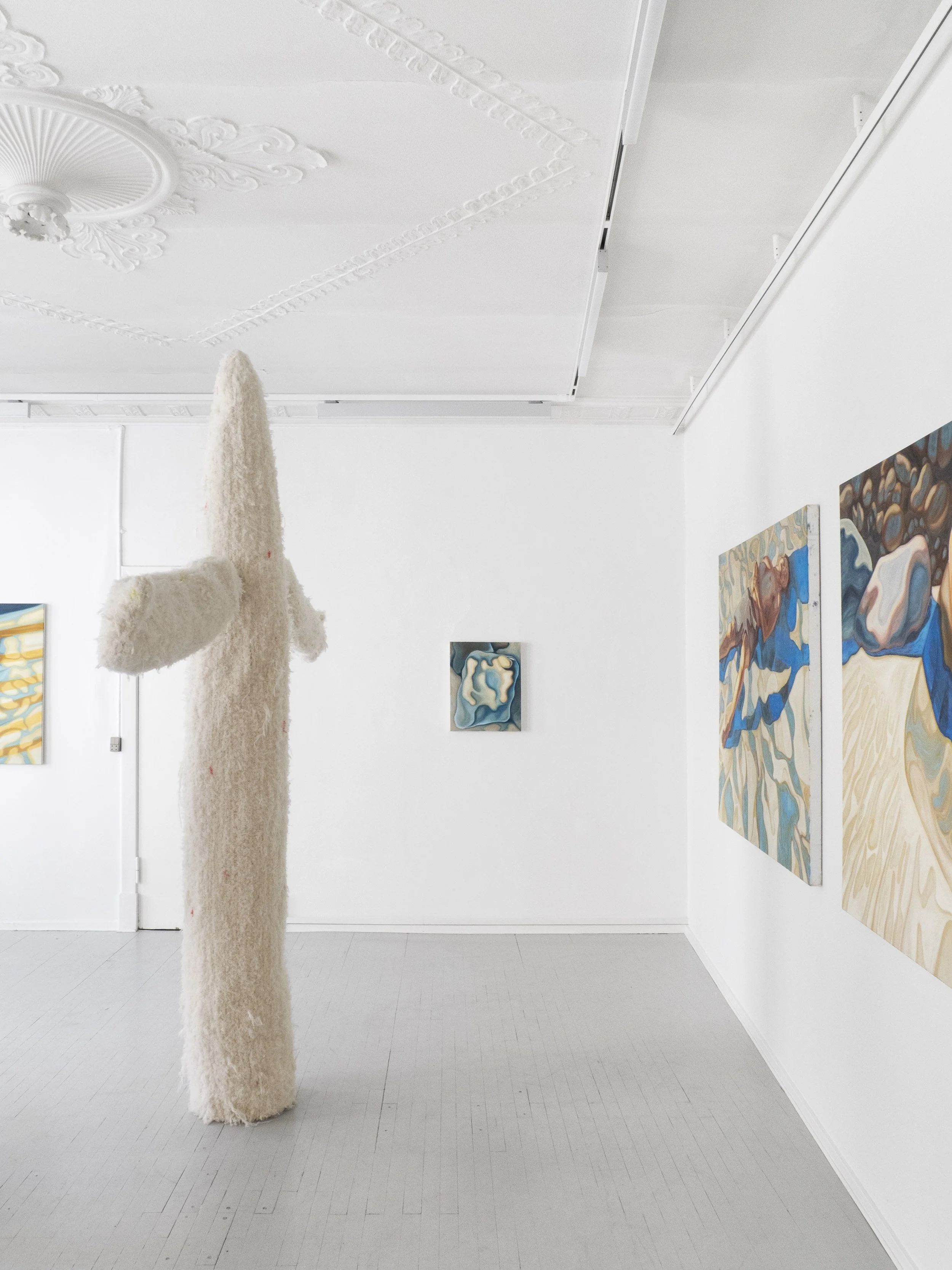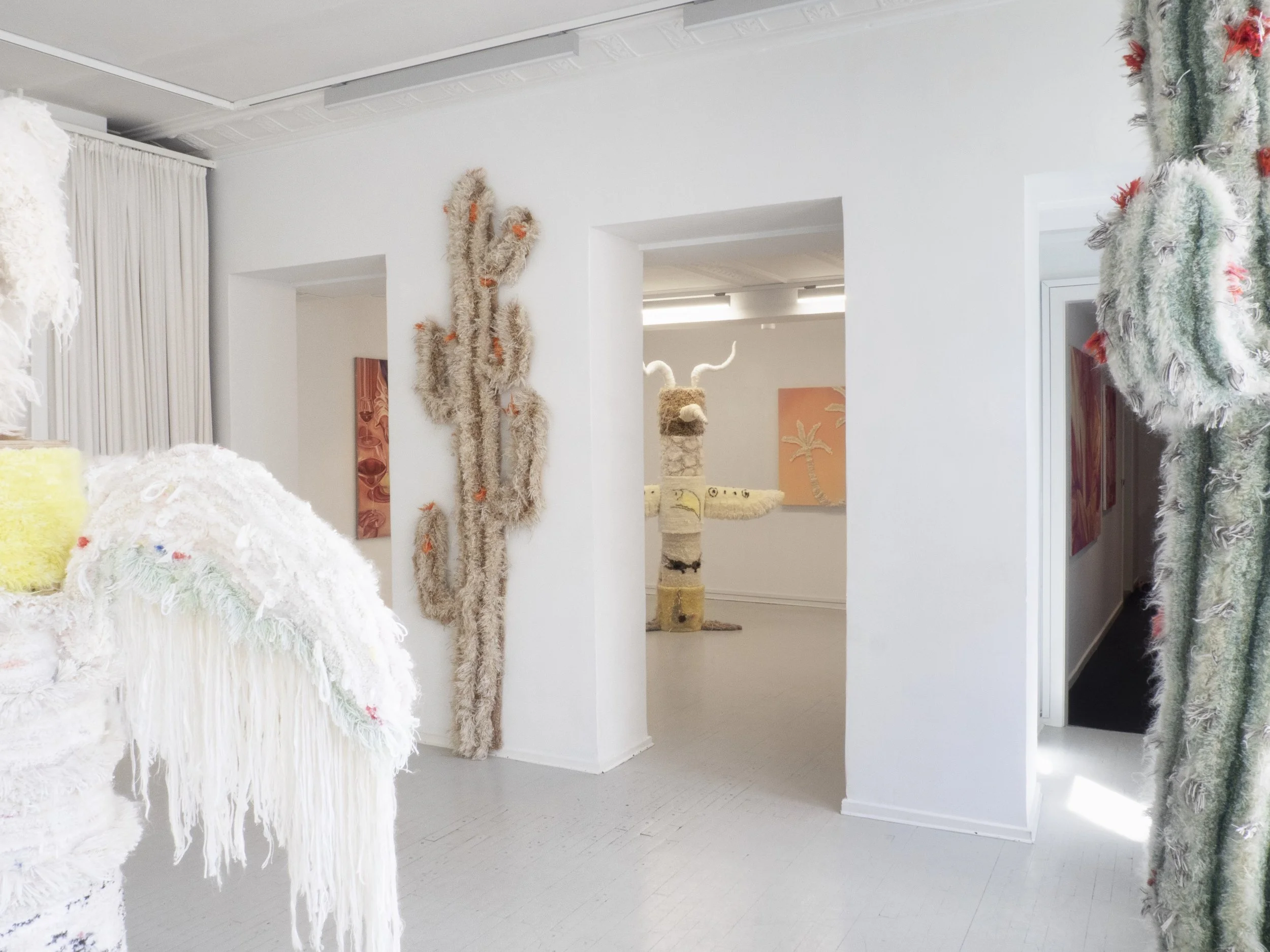 Nina Ekman’s fuzzy practice is hard to place as it floats between painting, textile, and sculpture, but always investigating themes such as sustainability, consumption, and the consequences of our planetary negligence. These themes also resonate in Ekman’s production as the artist mainly uses excess deadstock yarn from the textile industry to create her pieces. The dilemma of maintaining modern life, while preserving the globe, is a driving force in Ekman’s work, and the artist’s soft cacti, fragmented structures resembling indigenous totem poles, and her tufted backdrops become poignant reminders that nothing lasts forever. Neither does the summer.